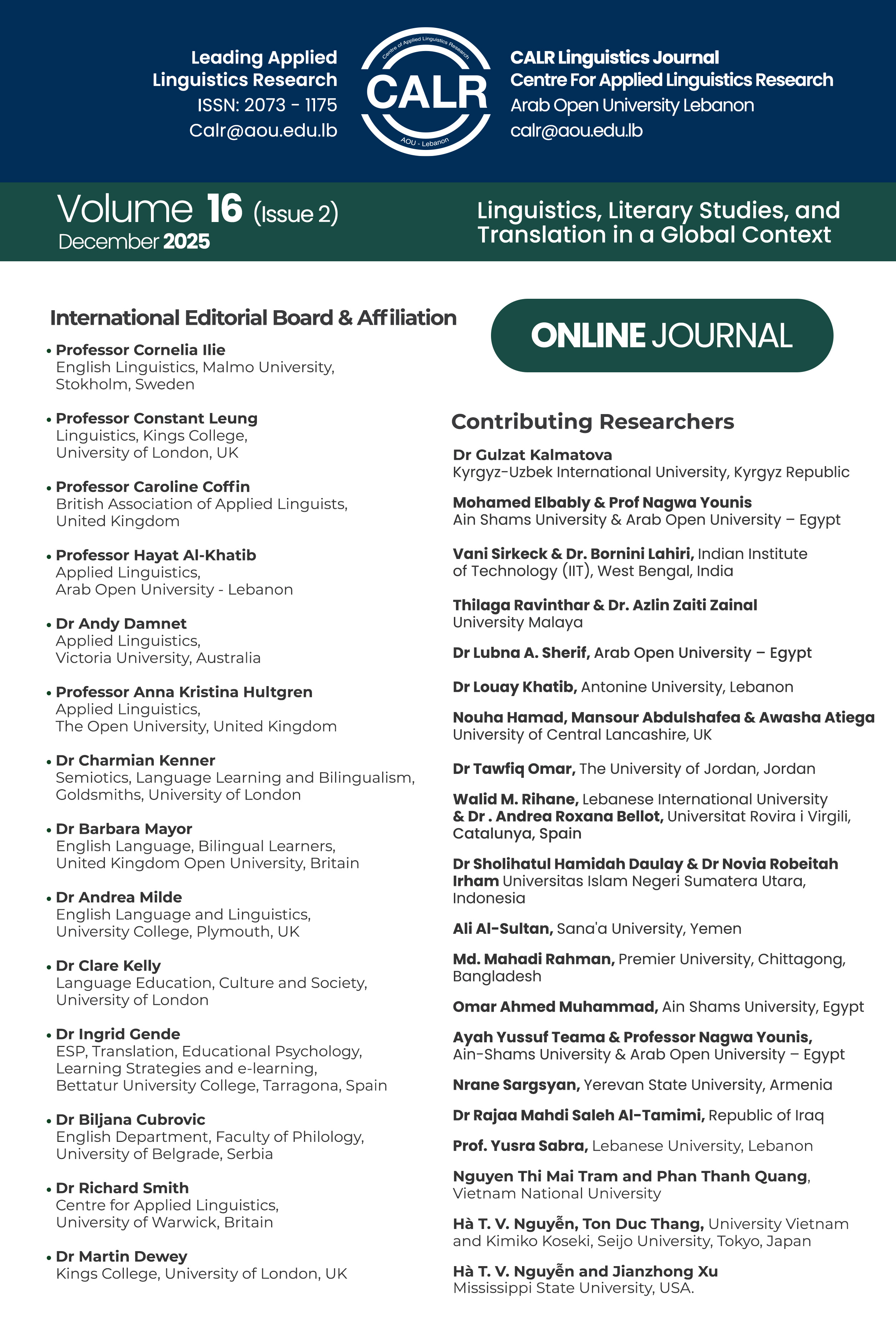 This study examines the linguistic landscape (hereinafter LL) of five areas in Lebanon: Achrafieh in Beirut, the capital, Baalbek in Beqaa, Bourj Hammoud in Mount Lebanon, Kawachira in Akkar, North Lebanon, and Nabatieh in South Lebanon. These areas are chosen via purposive sampling because each of them displays idiosyncratic socio-linguistic political features. The focus in these areas is on the visual aspect, mainly through signs of shops, buildings, bulletin boards, streets and the like to identify the different languages used and to understand the reasons behind the language choices. Through a sociolinguistic, mixed design that combines both the qualitative and the quantitative modes of research, the study investigates the state of multilingualism in these areas by analyzing 222 signs coupled with 25 interviews. The signs are selected from the main streets in these areas and then analyzed following an integrated framework adopting Ben-Rafael et al. (2008) bottom-up and top-down perspective to separate the public and the private signs, Reh’s (2004) framework of categorization: duplication, overlapping, fragmentation, and complementarity in multilingual texts, and Scollon and Scollon’s (2003) discourse analysis of multilingual signage in diverse environments. The results show the choice of the language(s) in a sign is affected by: sociolinguistics, economics, ideology, identity, power, and globalization. English dominated signs in areas that were known for their strong Arabic identity like Baalbek and Nabatieh, whereas Armenian and Turkish were prevalent in Bourj Hammoud and Kawachira respectively as a sign to identity retention. Class also impacted the languages in signs, especially in Achrafiyeh, where French as ‘la langue de salon’ takes prominence. Arabic as the national language is still dominant in top-down signs.